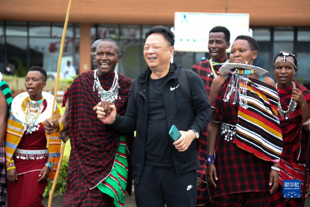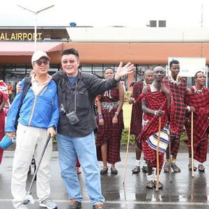 4月22日,在坦桑尼亞乞力馬扎羅國(guó)際機(jī)場(chǎng),中國(guó)游客與身著坦桑尼亞傳統(tǒng)服飾的當(dāng)?shù)厝撕嫌啊?/p>