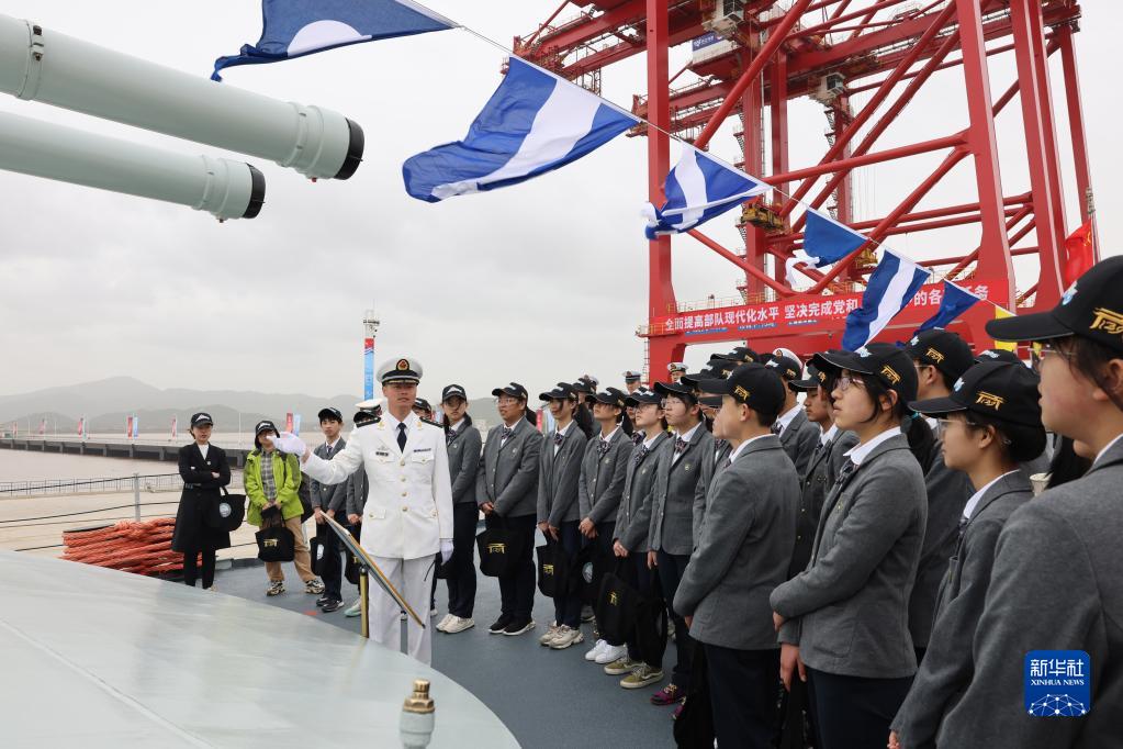 4月23日,海軍組織“戰艦與城市”雙擁共建主題活動,寧波市師生代表參觀寧波艦。新華社發(孟印祺 攝)