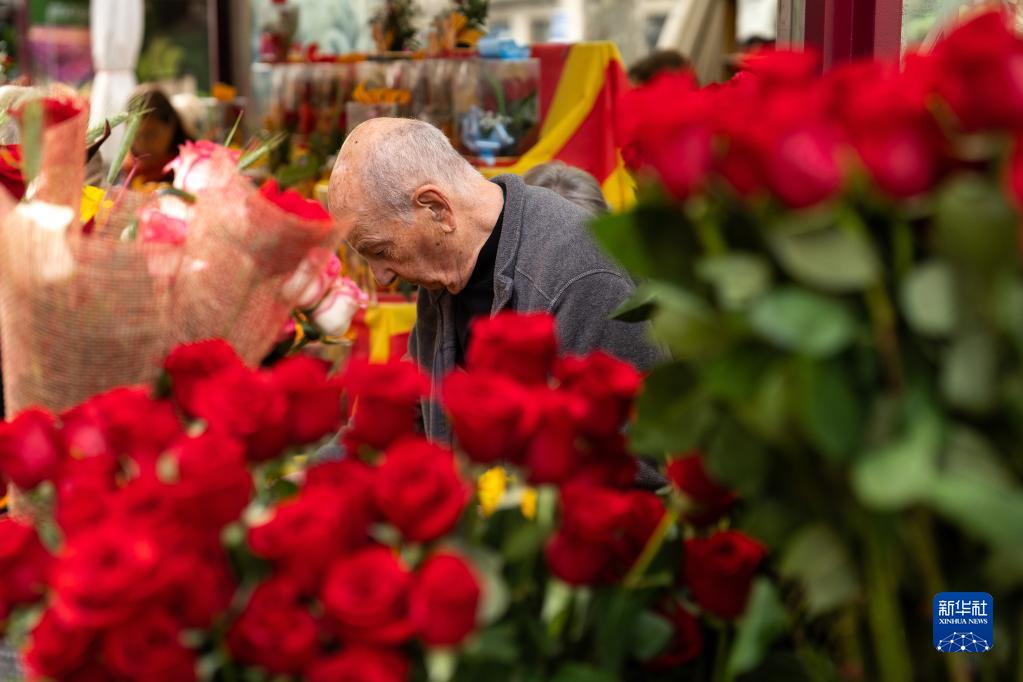 4月23日,花店員工在西班牙巴塞羅那街頭準備鮮花。