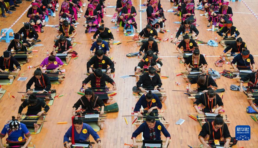 4月23日在海南省樂東黎族自治縣拍攝的黎錦苗繡技藝比賽現(xiàn)場(chǎng)。