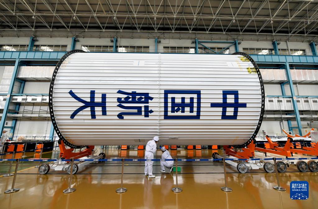 在航天科技集團一院天津火箭公司總裝測試車間,裝配一組班組成員在進行火箭裝配(4月19日攝)。