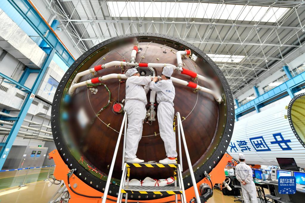 在航天科技集團一院天津火箭公司總裝測試車間,班組人員在進行火箭裝配(4月19日攝)。