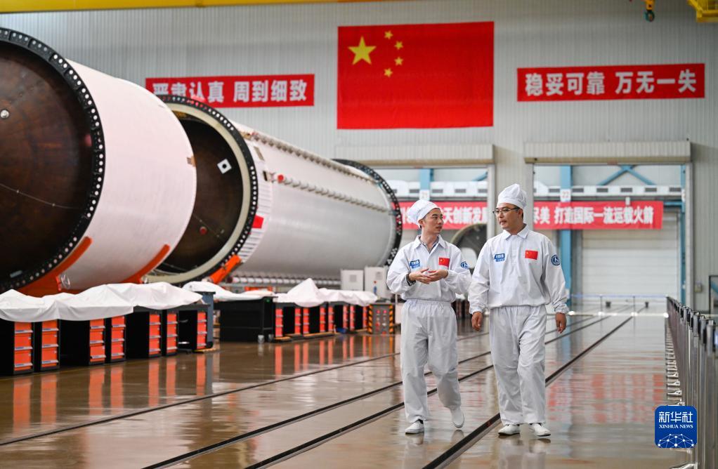 在航天科技集團一院天津火箭公司總裝測試車間,駱鑫生(左)與班組副組長王海洋交流(4月19日攝)。