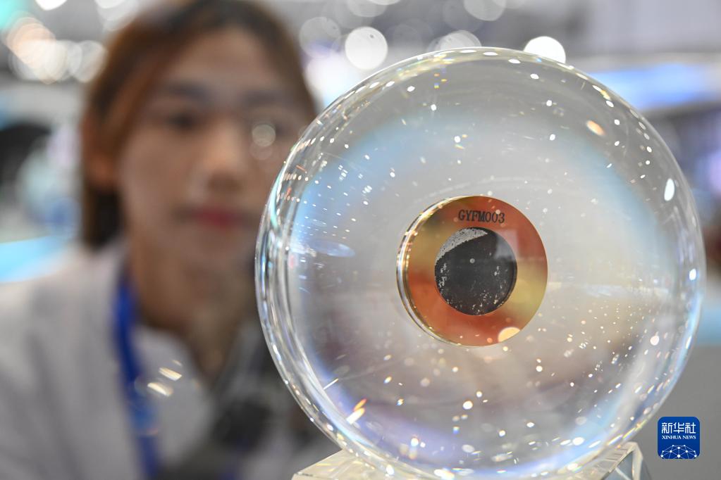 4月24日,觀眾在2023年“中國(guó)航天日”科普展覽上觀察月壤。