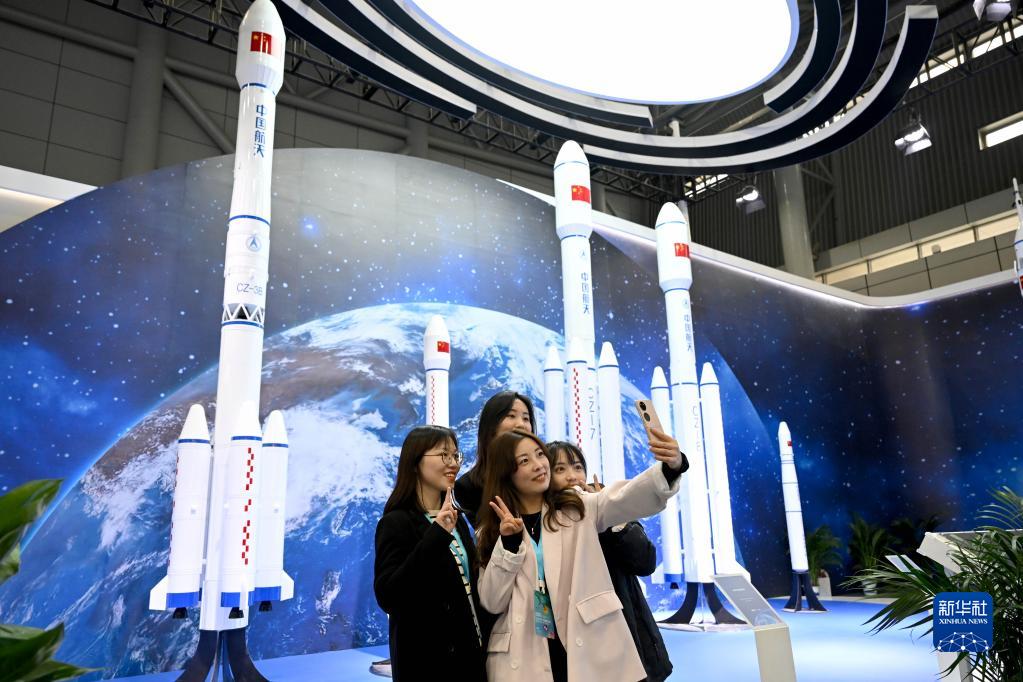 4月24日,觀眾在2023年“中國航天日”科普展覽上合影留念。