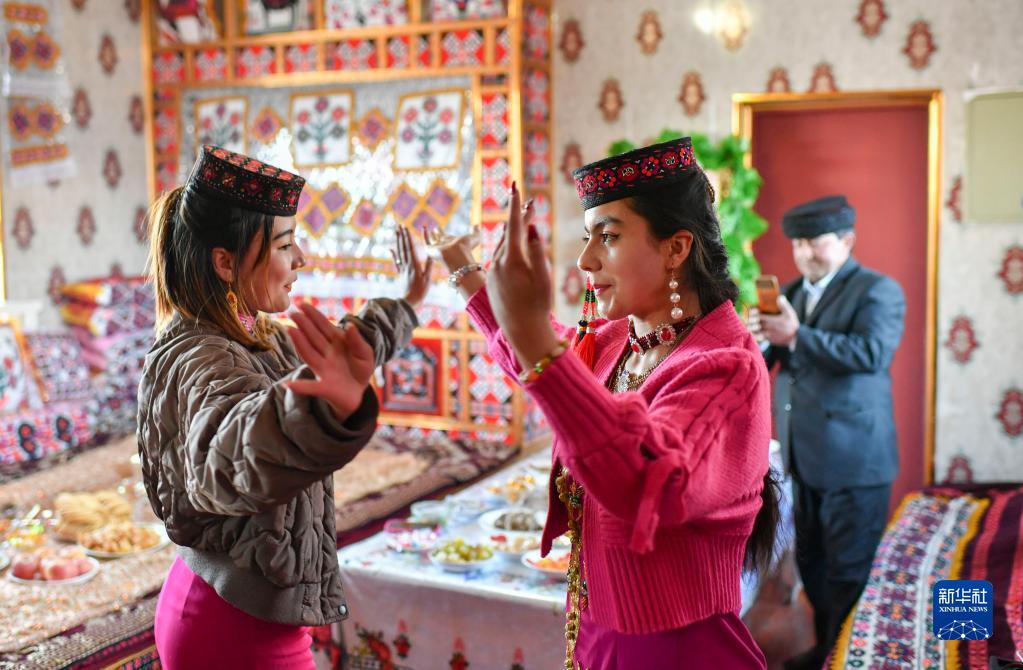 新疆塔什庫爾干塔吉克自治縣愛民村,牧民都熱·加爾曼的侄女古扎麗努爾(前右)帶著好朋友來串門拜訪,都熱·加爾曼在一旁拍攝視頻(3月21日攝)。2018年冬,都熱一家享受易地扶貧搬遷政策,搬遷至距離縣城約30公里的新村。在惠民政策的引導下,都熱一家靠雙手創造了與祖輩不同的新生活。