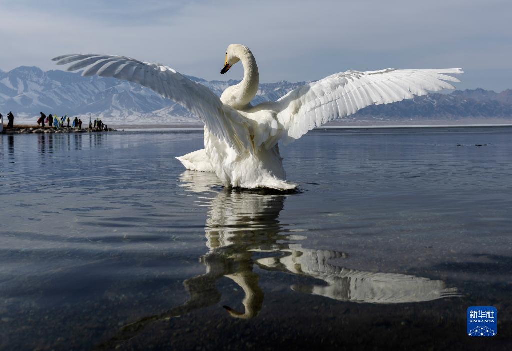 新疆博爾塔拉蒙古自治州,天鵝在賽里木湖振翅欲翔(4月6日攝)。
