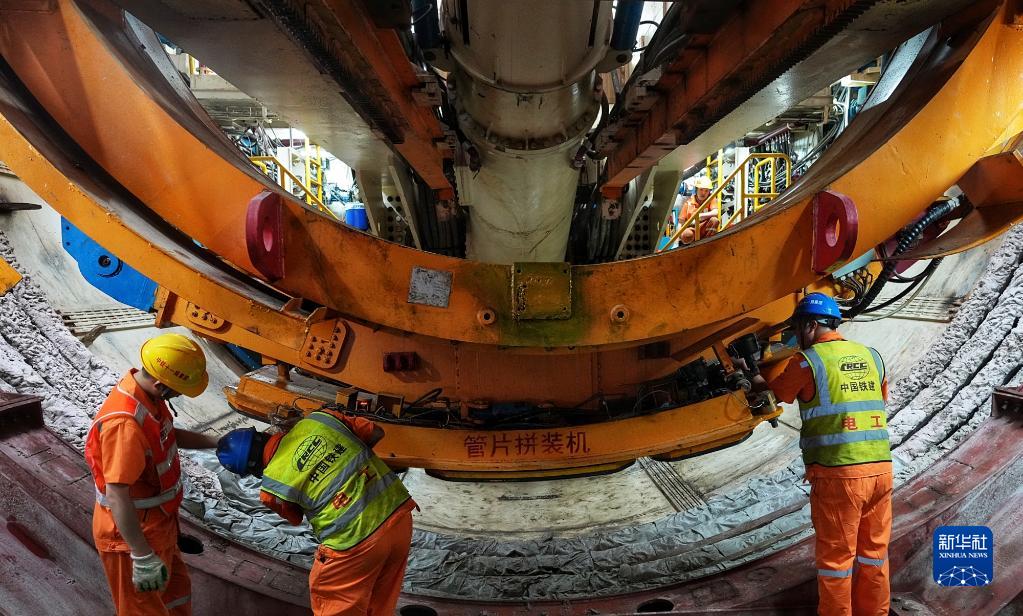 4月24日,中鐵十一局技術人員檢查準備始發的“鐵兵廣花13號”盾構機的管片拼裝機。