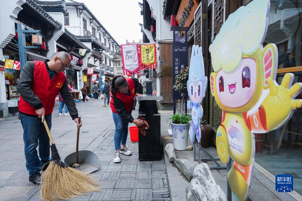 4月24日,在建德市梅城鎮(zhèn)古街,社區(qū)黨員干部、志愿者在打掃古鎮(zhèn)衛(wèi)生。