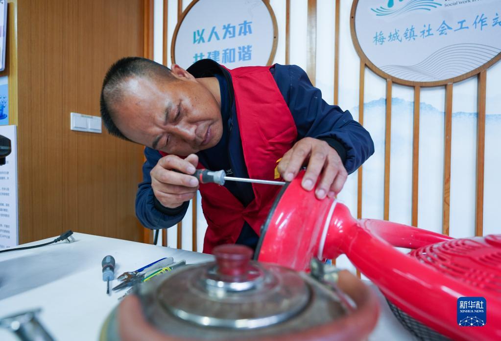 4月24日,在建德市梅城鎮古街,社區志愿者為居民提供修理電器服務。