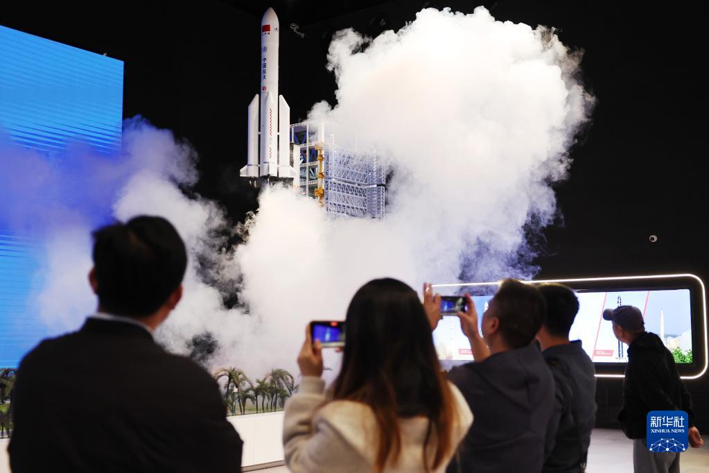 4月24日,觀眾在中國航天博物館觀看長征五號運載火箭發(fā)射轉(zhuǎn)運場景模擬演示。