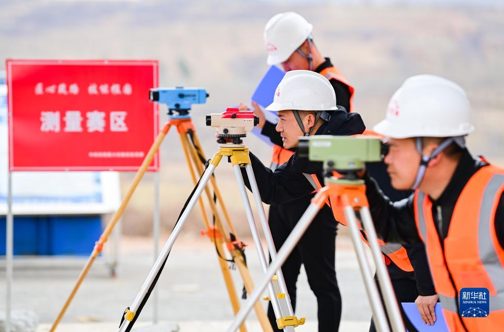 4月24日,建設(shè)者參加測量項(xiàng)目比賽。