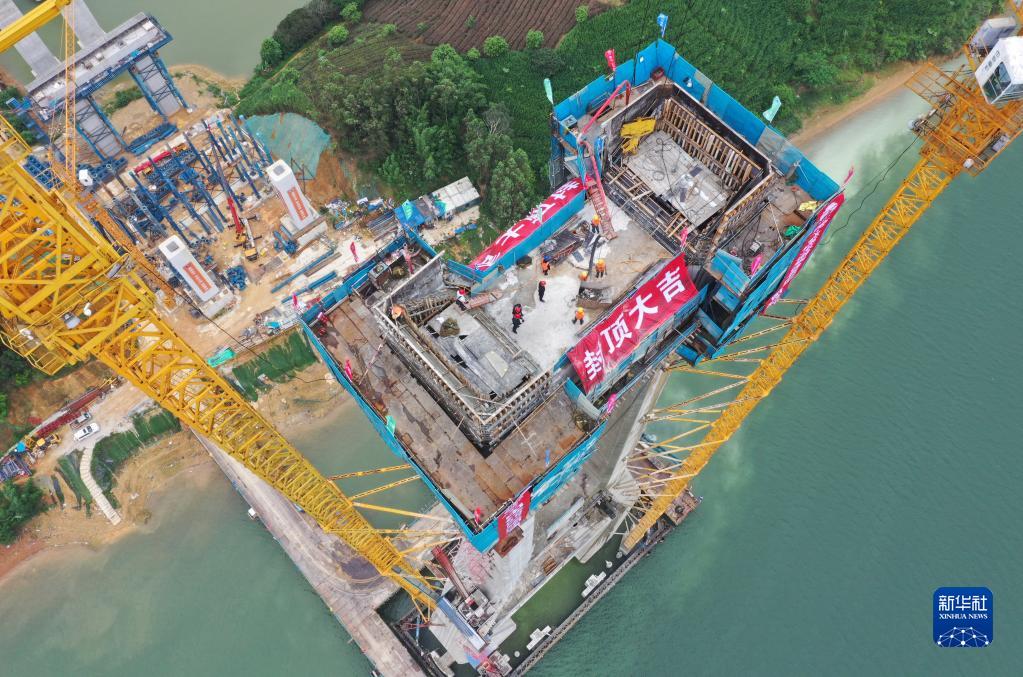4月24日,在廣西上橫高速公路西津郁江特大橋建設(shè)現(xiàn)場,中鐵四局集團工人在進行主塔封頂施工(無人機照片)。