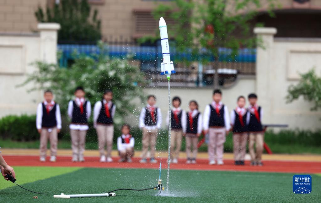 4月24日,在河北省石家莊市西古城小學,學生們在老師帶領下進行“水火箭”發射體驗。