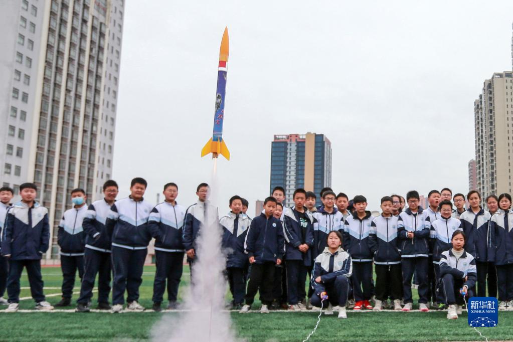 4月24日,安徽省淮北市第二中學的學生們體驗發射“小力士”傘降火箭。