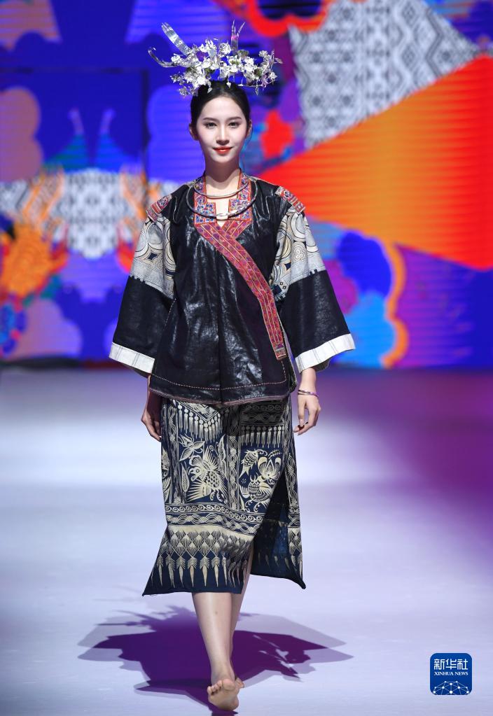 模特在廣西南寧市廣西文化藝術中心展示民族元素服飾(4月24日攝)。