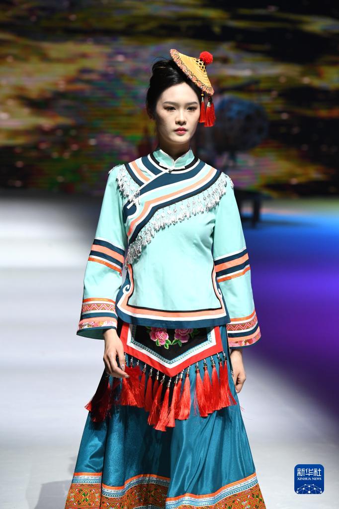 模特在廣西南寧市廣西文化藝術中心展示民族元素服飾(4月24日攝)。