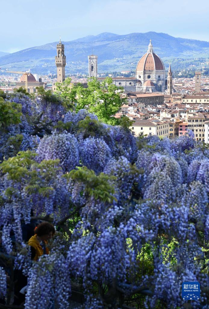 意大利佛羅倫薩巴爾迪尼花園近日紫藤花盛放,吸引眾多游客前來觀賞。