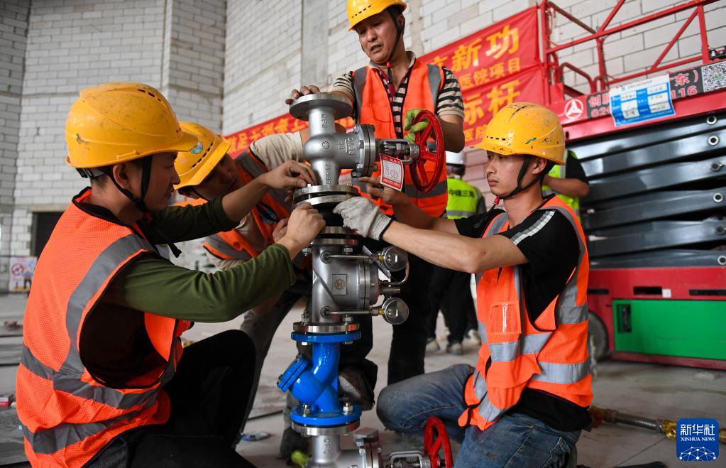 4月25日,在深圳前海泰康國際醫院項目工地,建筑工人參加閥門組裝工藝技能比拼。