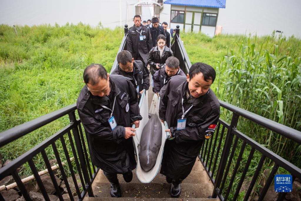 4月25日,工作人員轉(zhuǎn)運(yùn)江豚至運(yùn)輸車輛上。