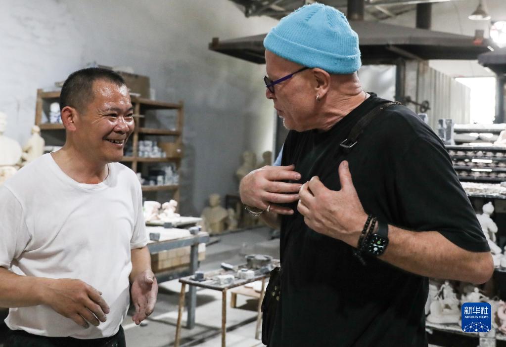 在江西景德鎮(zhèn)雕塑瓷廠,托爾斯滕·尤雷爾與相熟的一名窯廠師傅寒暄(4月20日攝)。