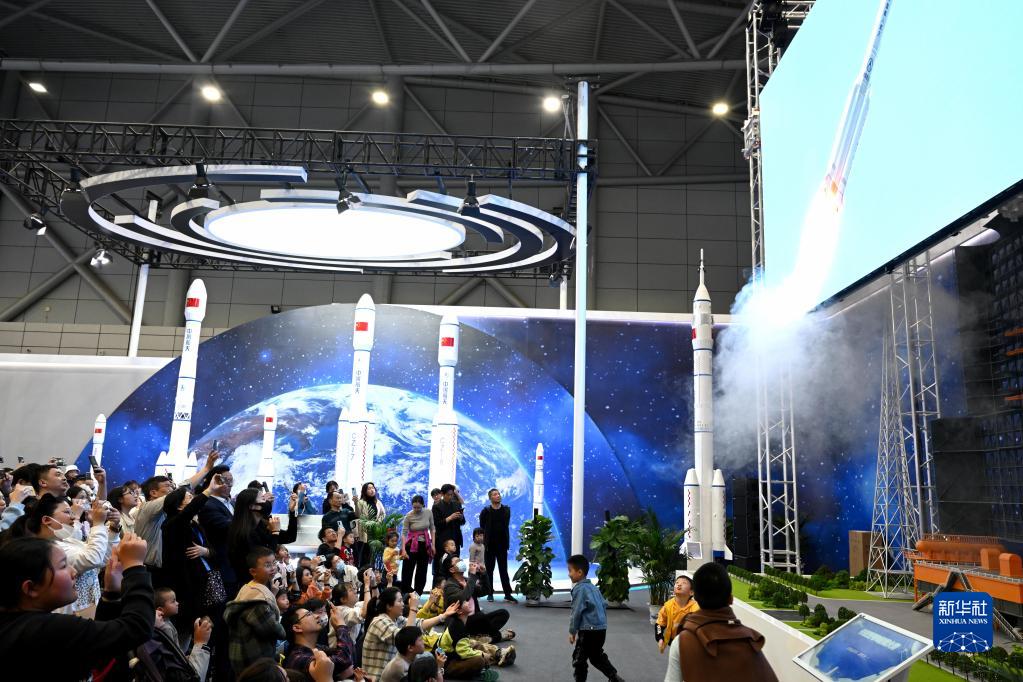 4月24日,觀眾在科普展區(qū)觀看長征五號(hào)B運(yùn)載火箭模擬發(fā)射。
