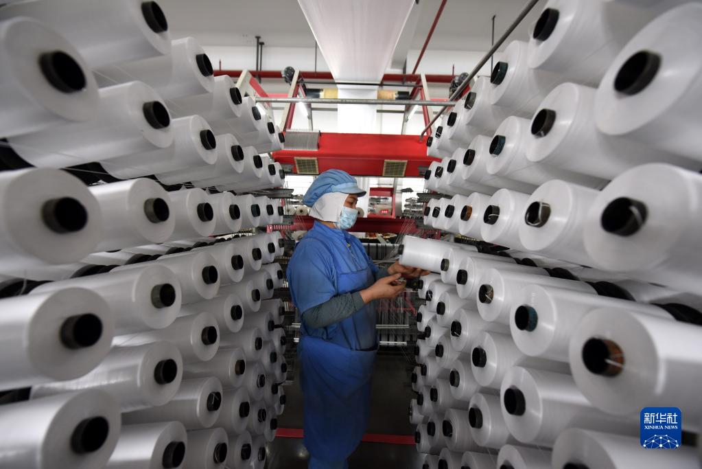 4月25日,在山東省臨沂市臨沭縣一塑編企業車間,工人加工塑編產品。