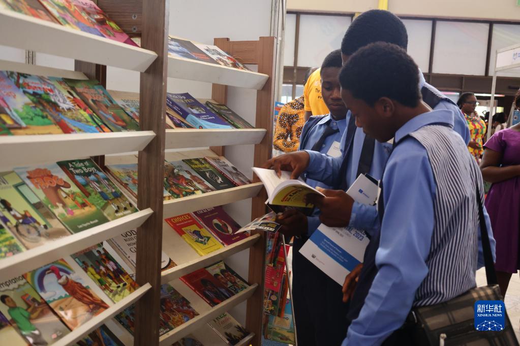 4月24日,在加納首都阿克拉舉辦的圖書展上,幾名學生在閱讀圖書。