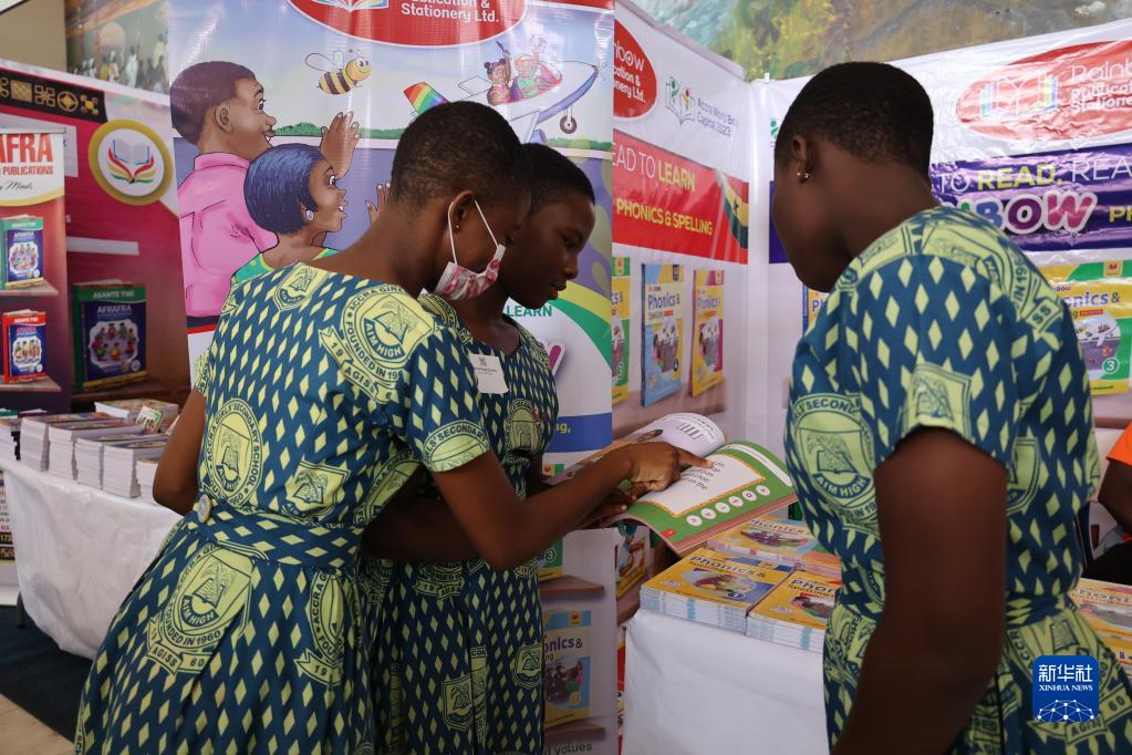 4月24日,在加納首都阿克拉舉辦的圖書展上,幾名學(xué)生在閱讀圖書。