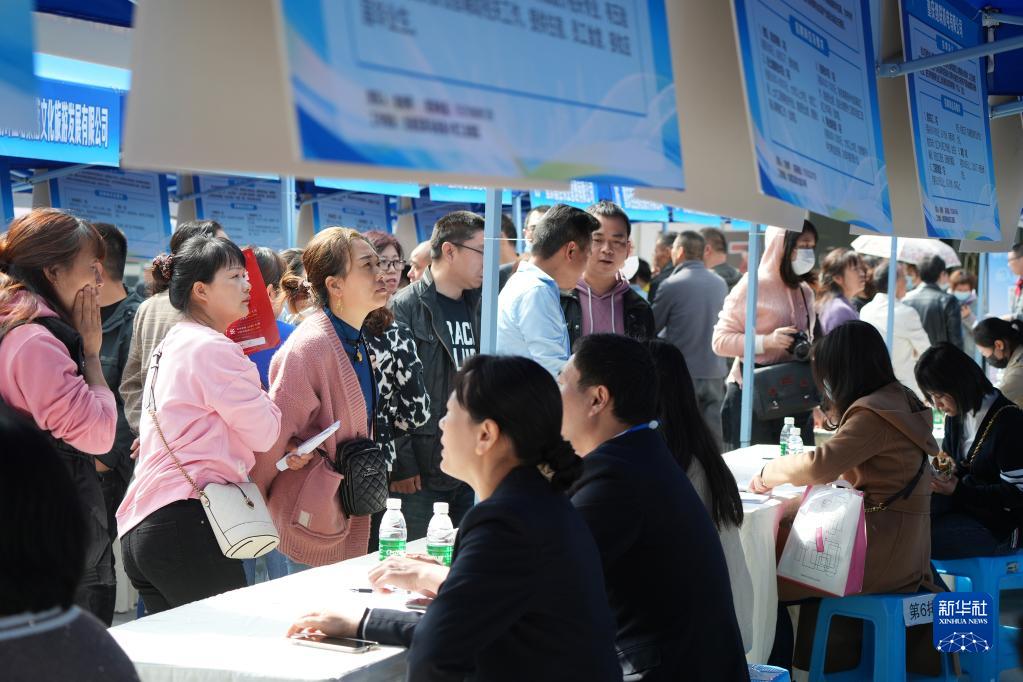 4月25日,求職者在重慶市北碚區(qū)吾悅廣場舉行的民營企業(yè)服務(wù)月專場招聘會現(xiàn)場了解用工信息。