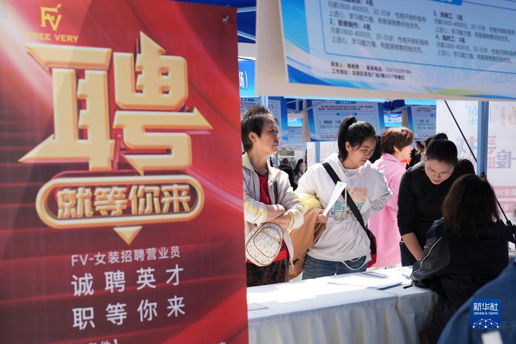 4月25日,求職者在重慶市北碚區吾悅廣場舉行的民營企業服務月專場招聘會現場了解用工信息。
