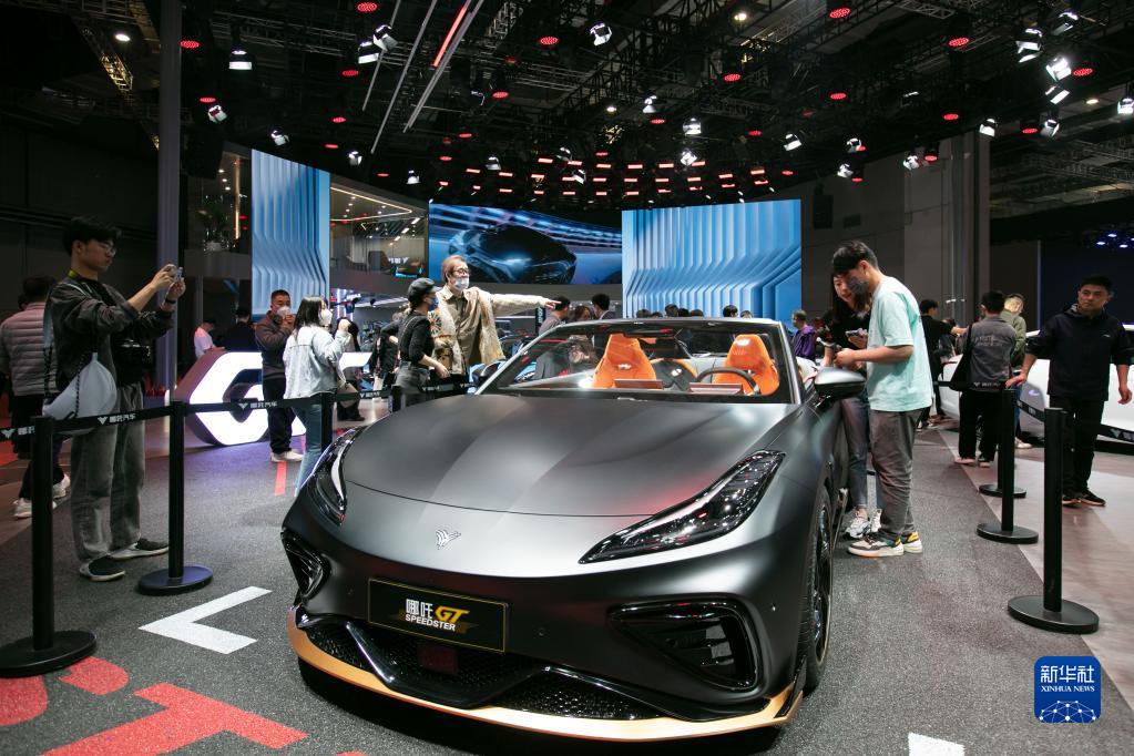 4月25日,參觀者在哪吒GT展車邊駐足觀看。