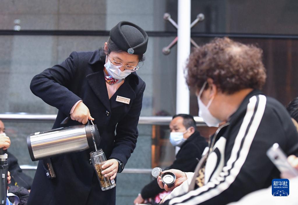 4月25日,在大連旅順西站,中鐵渤海輪渡公司的工作人員為候船的旅客倒水。
