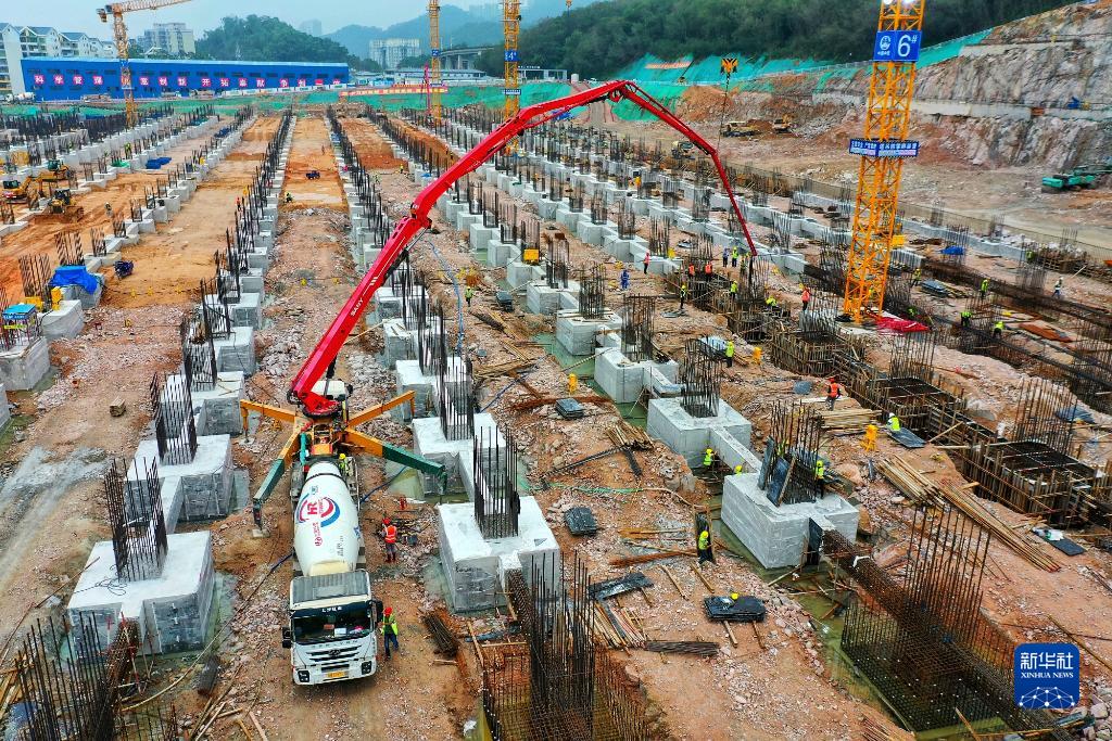建設(shè)中的深圳地鐵5號(hào)線上水徑停車場(chǎng)正在進(jìn)行底板獨(dú)立基礎(chǔ)混凝土澆筑和鋼筋籠綁扎作業(yè)(4月25日攝,無(wú)人機(jī)照片)。