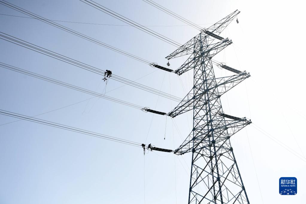電力工人劉李家、段信陽、王春龍?jiān)诟呖兆鳂I(yè)(4月20日攝)。