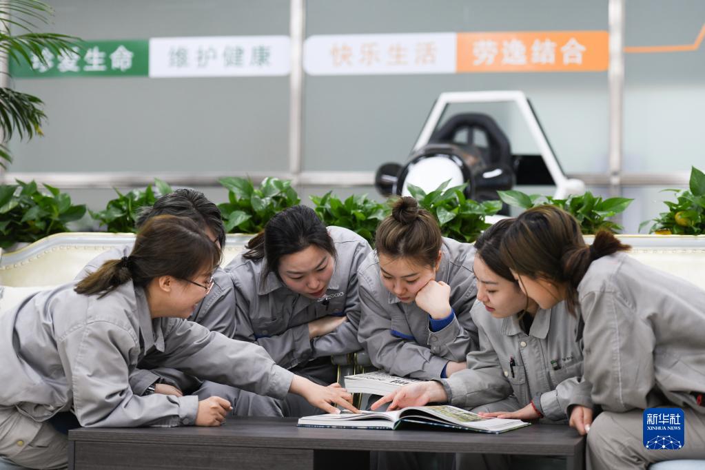 在哈爾濱動車段,“雪絨花”女子班組部分成員在休息室中聊天(4月25日攝)。