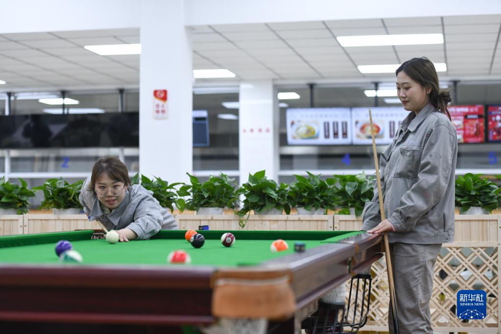 在哈爾濱動車段,于夢晗(左)在單位的休閑娛樂區域與同事康穎昕一同打臺球。康穎昕出生于2002年,去年剛入職的她是“雪絨花”女子班組中年齡最小的(4月25日攝)。