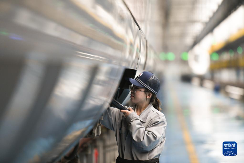 在中國鐵路哈爾濱局集團有限公司哈爾濱動車段整備庫,“雪絨花”女子班組的機械師們正緊張地為動車段配屬的動車組進行檢修作業,為即將到來的“五一”小長假鐵路運輸做好運力安全保障。