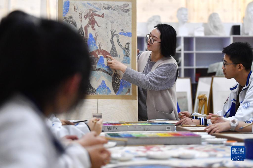 近年來,甘肅省敦煌市敦煌中學將敦煌壁畫藝術引入校園,整合專業師資力量,通過美術課堂、社團活動和主題實踐的方式,加強學生對敦煌壁畫藝術的了解,讓有興趣的學生在校園里開展壁畫臨摹和藝術創作,豐富校園文化生活,讓學生感受敦煌文化的魅力。