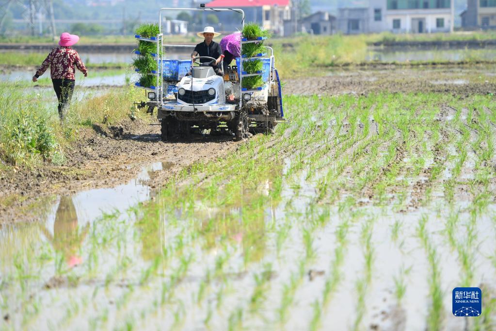 4月26日,在湘潭市雨湖區(qū)姜畬鎮(zhèn)易建河村的一處高標(biāo)準(zhǔn)農(nóng)田,農(nóng)民駕駛插秧機(jī)插秧。