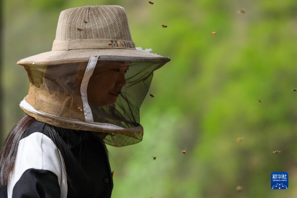 陳曉麗在了解村民胡書獻(xiàn)的養(yǎng)蜂情況(4月18日攝)。新華社記者 張鋮 攝