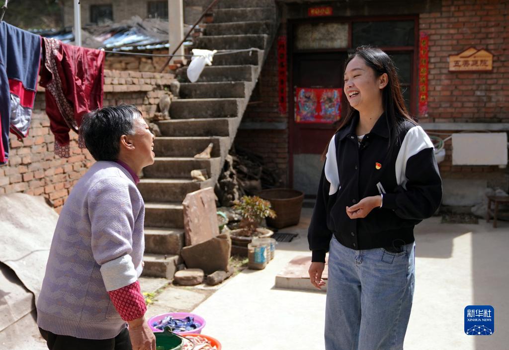 陳曉麗(右)在和村民胡金英聊天,詢問生活情況(4月18日攝)。新華社記者 李安 攝