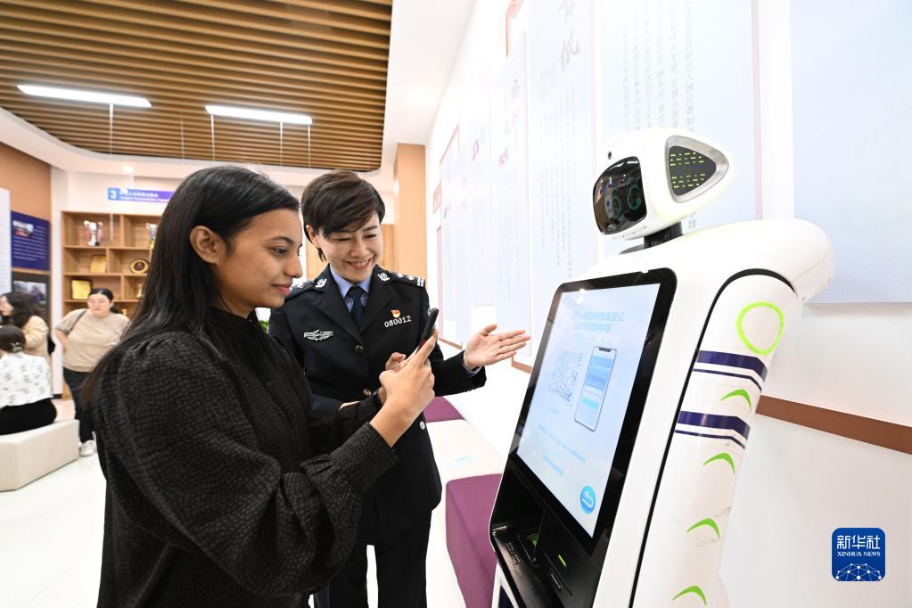 4月26日,在天津工業大學出入境事務服務中心,天津市公安局出入境管理局民警協助留學生通過網上系統進行境外人員臨時住宿登記。