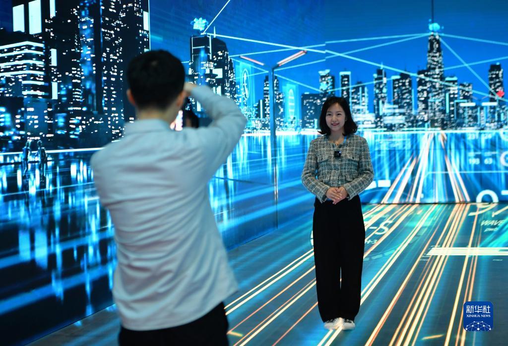 4月26日,在第六屆數字中國建設成果展覽會上,媒體記者在激光全息投影現場體驗拍攝。