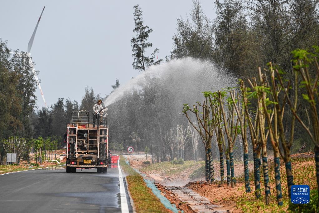 4月25日,工人在海南環島旅游公路東方段為新種的樹木澆水。