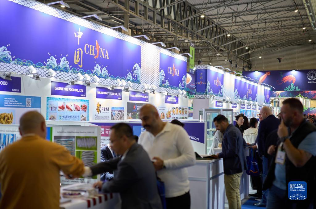 這是4月25日在西班牙巴塞羅那舉行的全球水產(chǎn)品博覽會(huì)上拍攝的中國展區(qū)。