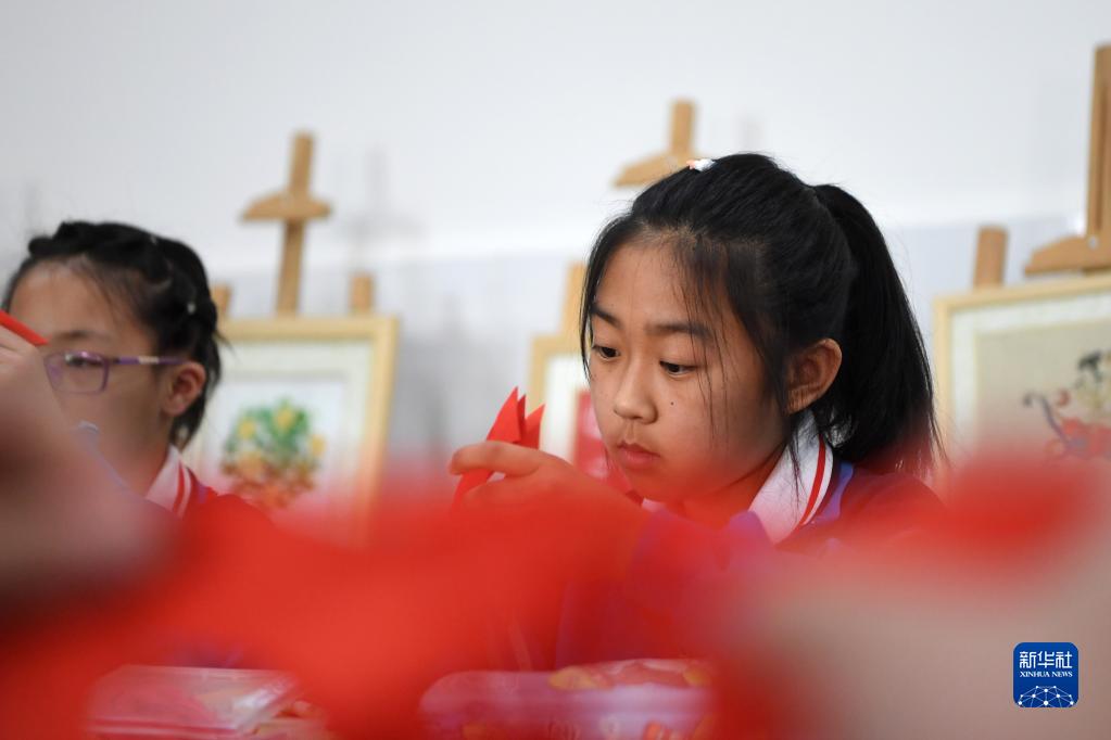 4月26日,在敦煌市西關小學,剪紙社團的學生在課后服務時間進行剪紙學習。
