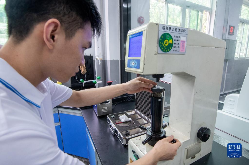 4月13日,在深圳市喜德盛自行車股份有限公司實驗室,工作人員在檢測自行車零件吊耳的硬度。