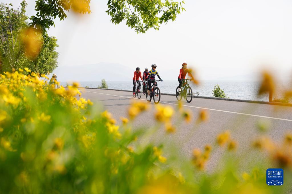 4月20日,騎行愛好者在云南大理洱海生態(tài)廊道騎行。
