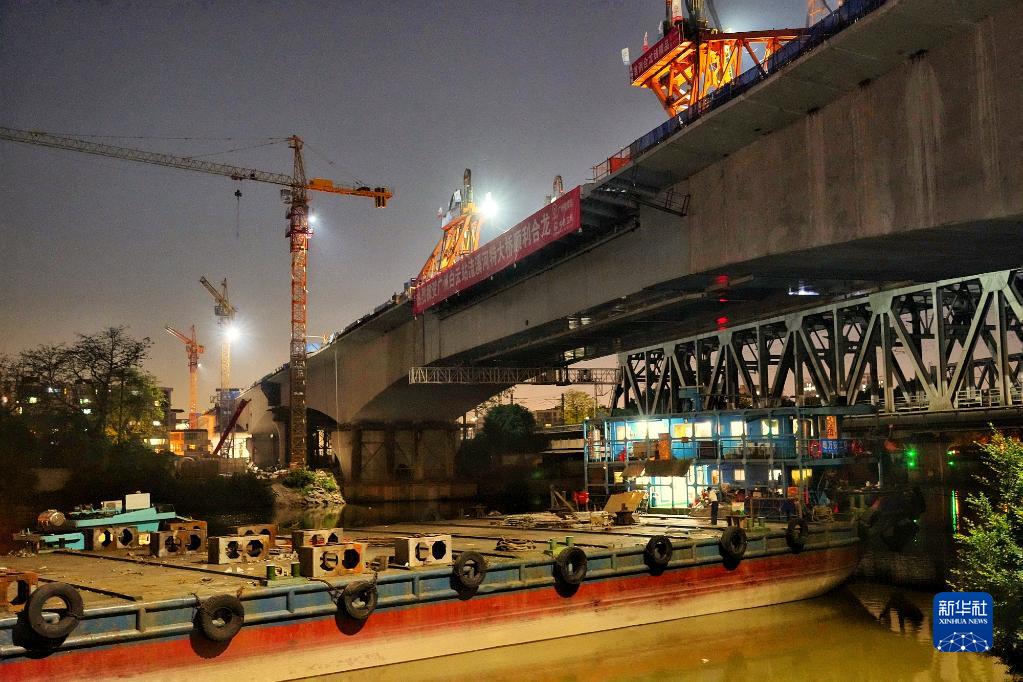 經過中鐵三局施工人員連續6小時整體吊裝和焊接,廣州白云火車站流溪河特大橋重達1100噸的鋼箱梁主梁與鋼混連接段于4月27日凌晨順利合龍。流溪河特大橋為京廣高鐵聯絡線和廣湛高鐵聯絡線四線鐵路并行橋梁。